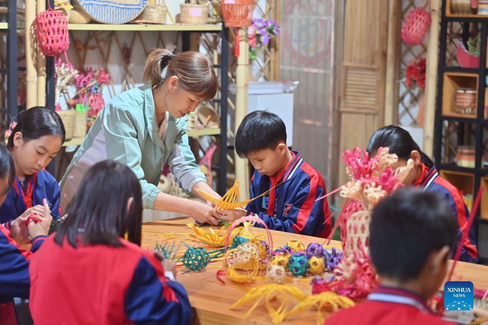 Students learn the bamboo weaving skill at Nandu primary school in Cenxi City, south China's Guangxi Zhuang Autonomous Region, Nov. 28, 2023. As a local intangible cultural heritage, the bamboo weaving skill was introduced to Nandu primary school in recent years, which enriched the extracurricular activities of the students. (Xinhua/Huang Xiaobang)