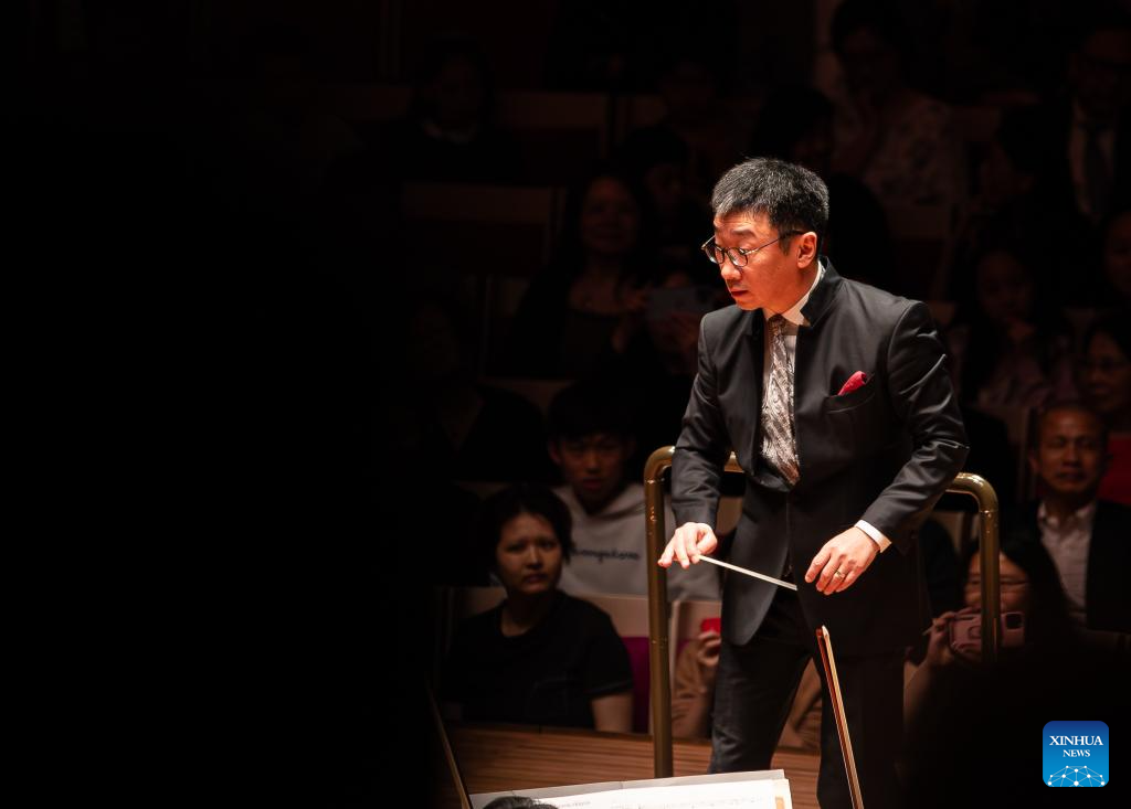 Conductor Li Xincao leads a performance by China National Symphony Orchestra at the Sydney Opera House in Sydney, Australia, Nov. 28, 2023. More than 80 musicians from the China National Symphony Orchestra performed western and Chinese compositions at the Sydney Opera House on Tuesday. (Photo by Hu Jingchen/Xinhua)