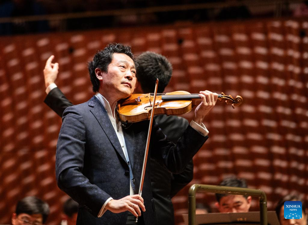 Violinist Lyu Siqing is pictured during a performance by China National Symphony Orchestra at the Sydney Opera House in Sydney, Australia, Nov. 28, 2023. More than 80 musicians from the China National Symphony Orchestra performed western and Chinese compositions at the Sydney Opera House on Tuesday. (Photo by Hu Jingchen/Xinhua)