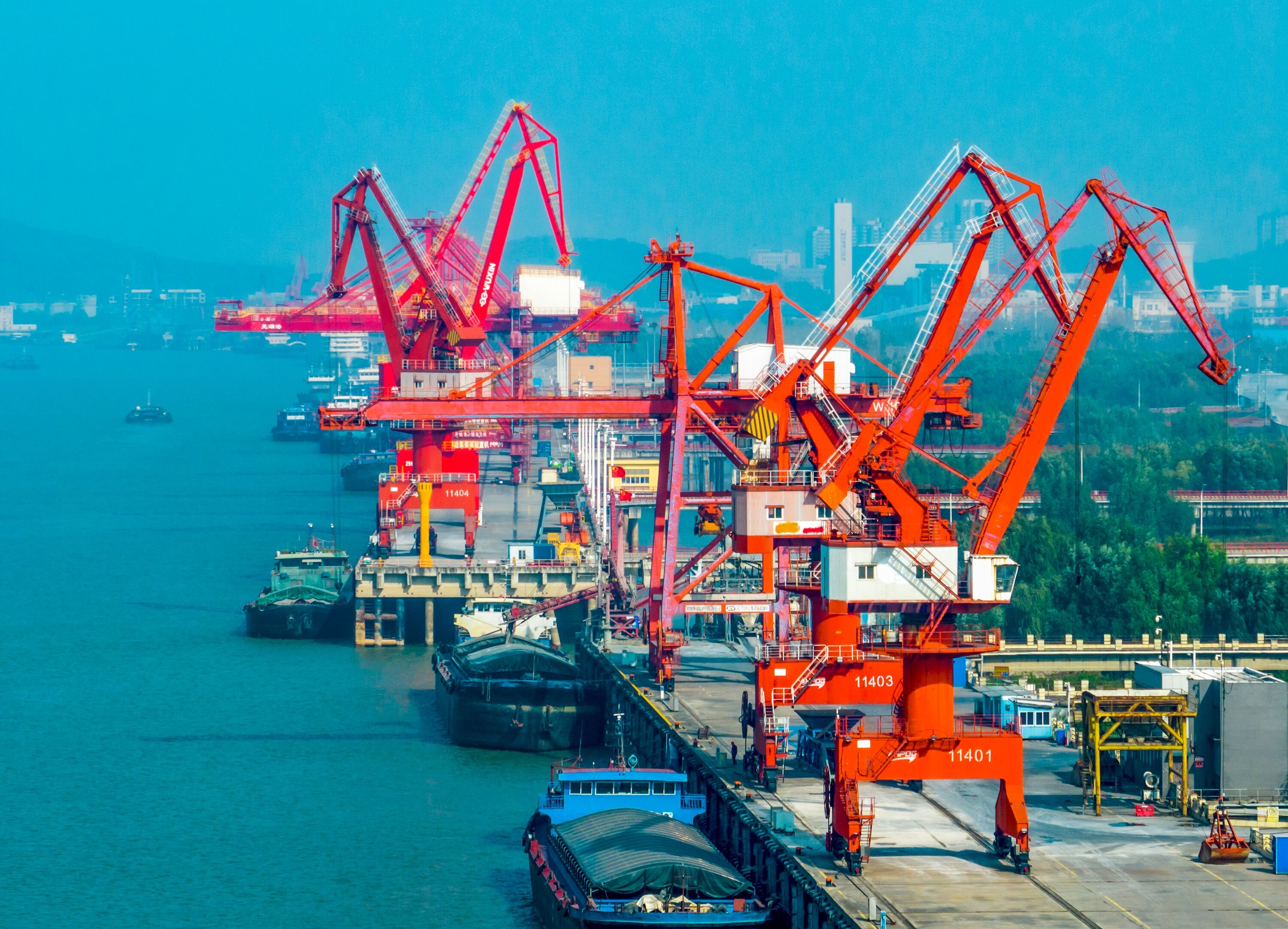 Cargos are lifted by cranes at an international container terminal of the Wuhu port in east China's Anhui province. (People's Daily Online/Xiao Benxiang)