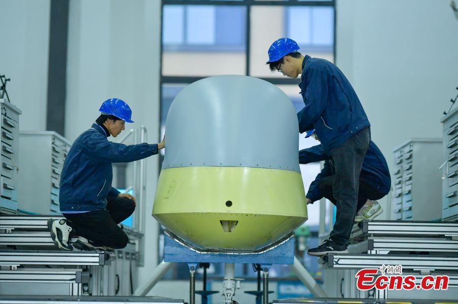 Technicians work at a production line of China's large civil unmanned aerial vehicle (UAV) Wing Loong in Zigong, southwest China's Sichuan Province, Nov. 28, 2023. (Photo: China News Service/Liu Zhongjun)