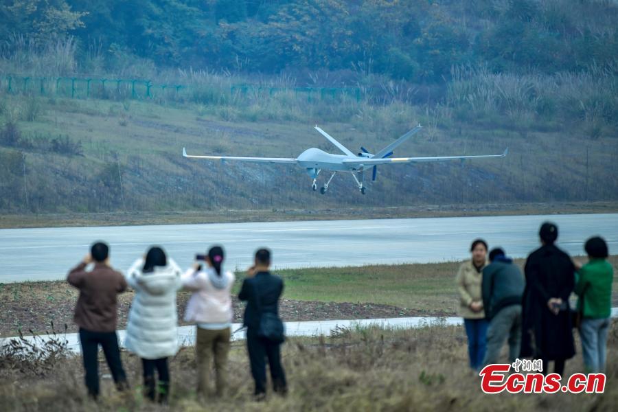 A Wing Loong-II large civil UAV takes off from the production base in Zigong, southwest China's Sichuan Province, Nov. 28, 2023. (Photo: China News Service/Liu Zhongjun)