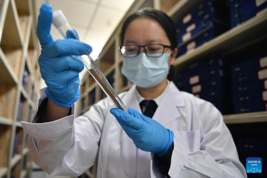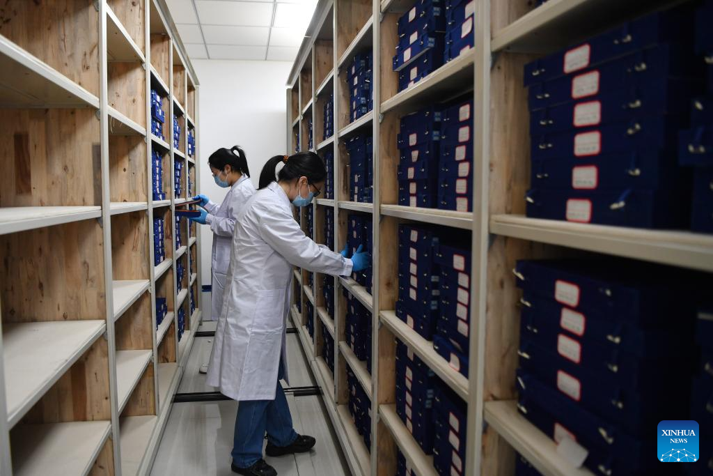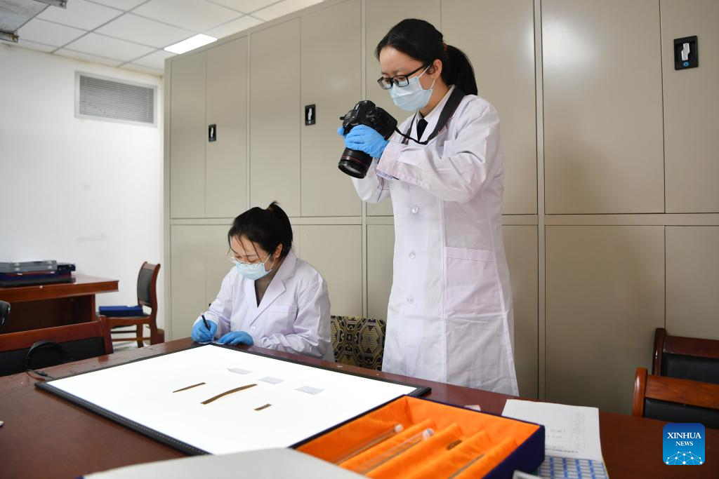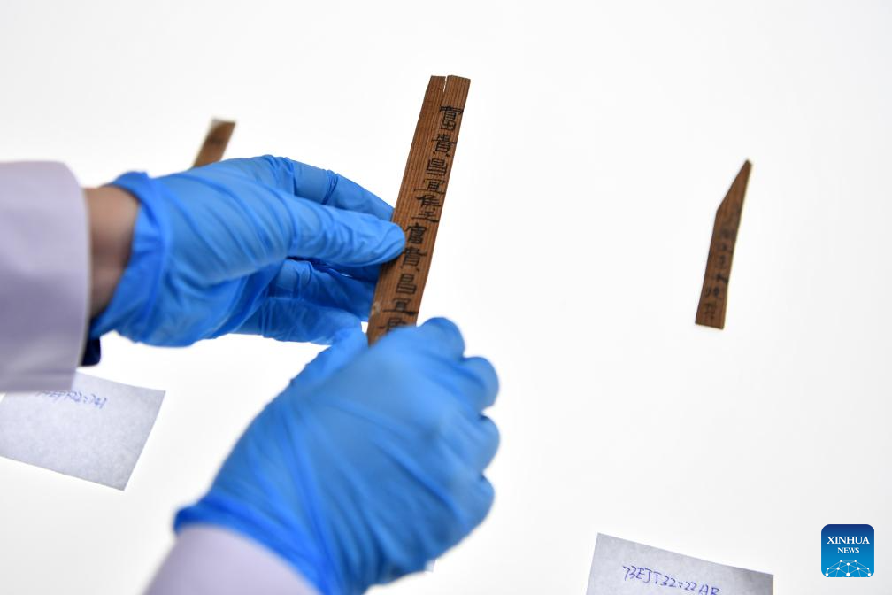 Staff member Yang Sheng checks the condition of preserved "Jiandu" at the warehouse of the Gansu Jiandu Museum in Lanzhou, northwest China's Gansu Province, Oct. 26, 2023. (Xinhua/Chen Bin)