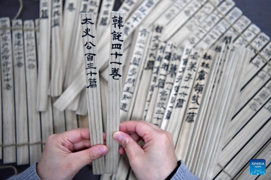 A staff member of the Gansu Jiandu Museum arranges self-made works of "Jiandu" in Lanzhou, northwest China's Gansu Province, Oct. 25, 2023. (Xinhua/Chen Bin)