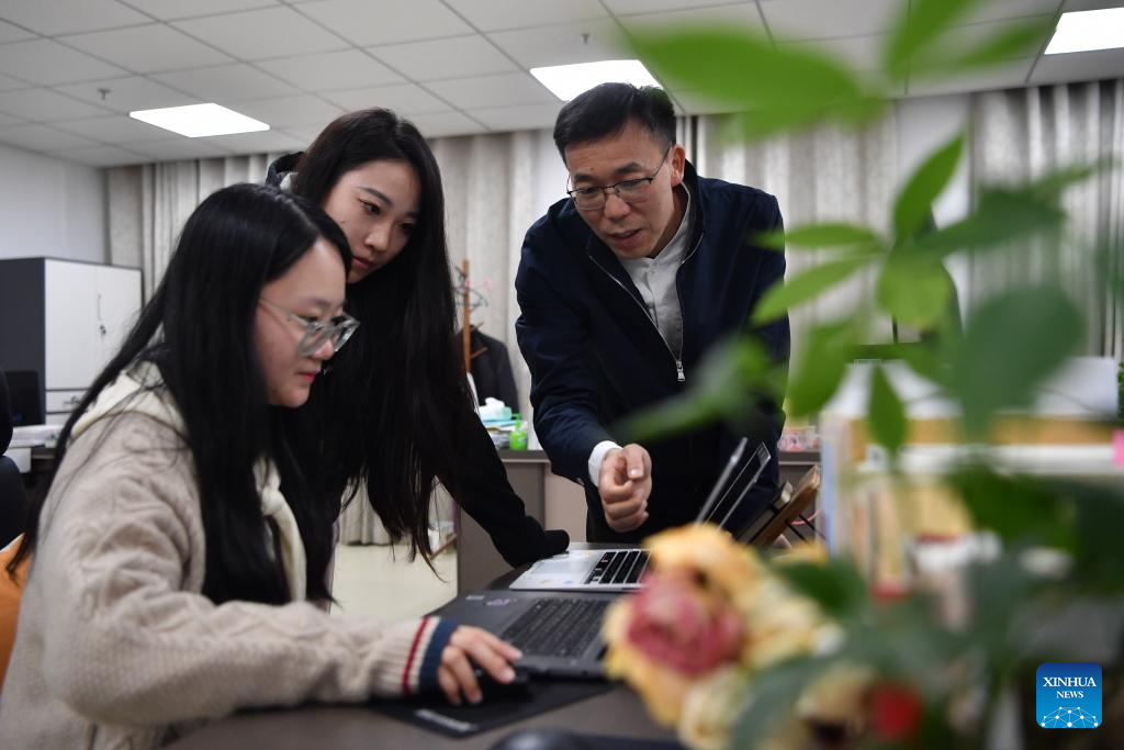 Xiao Congli (1st R), research director of the Gansu Jiandu Museum, talks with colleagues about digitalization of "Jiandu" in Lanzhou, northwest China's Gansu Province, Oct. 25, 2023. (Xinhua/Chen Bin)