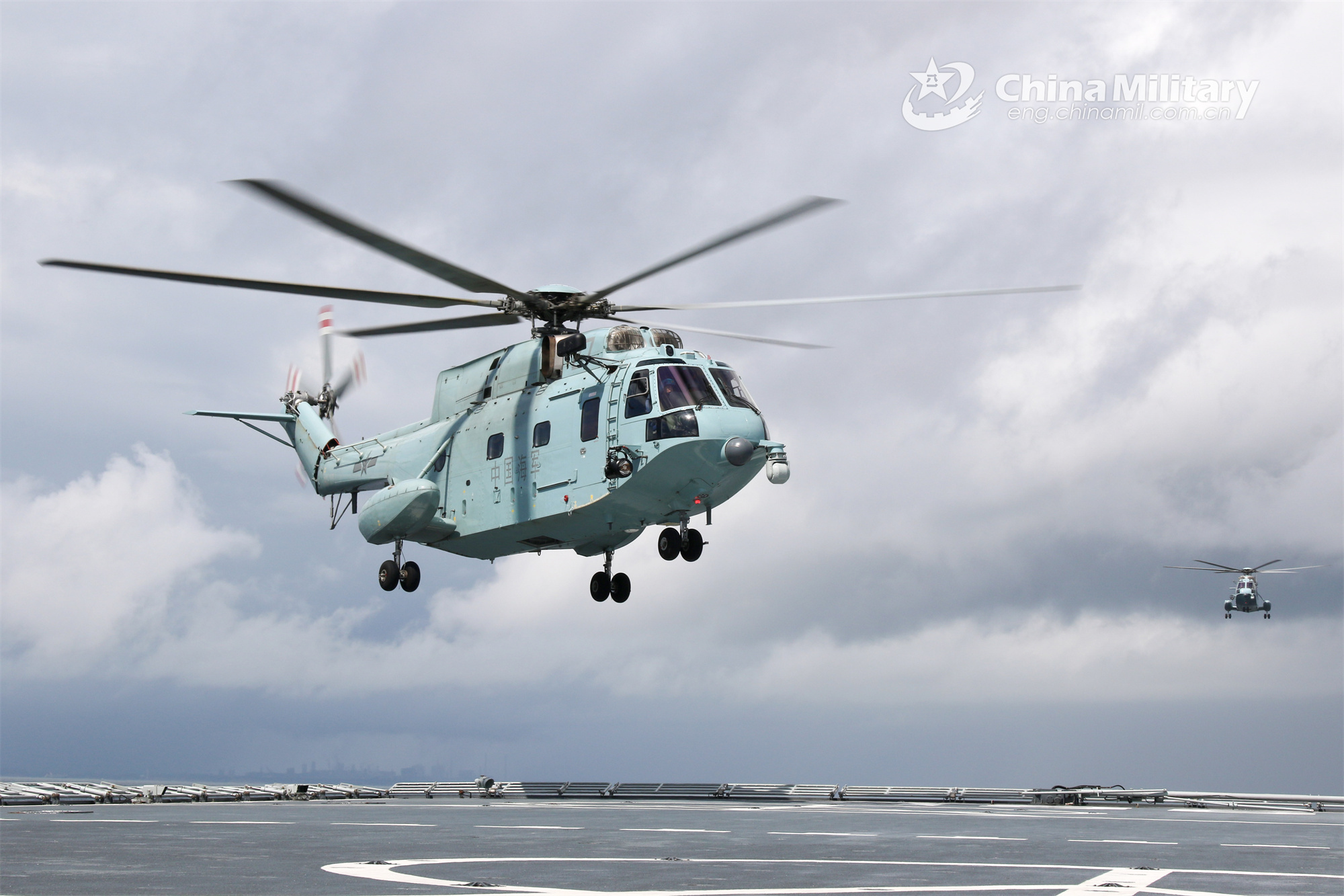 A helicopter attached to a brigade of the PLA Navy lands on the deck of a warship during a deck landing training exercise. The exercise was co-held by a naval brigade and a naval landing ship flotilla in recent days to enhance the flight skills of the junior pilots. (eng.chinamil.com.cn/Photo by Li Yunfei)
