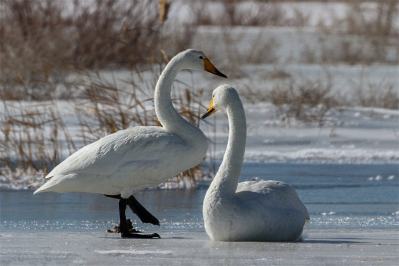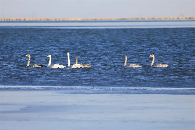 Whooper swans are seen in the Keluke Lake-Tuosu Lake Nature Reserve in Haixi Mongolian and Tibetan Autonomous Prefecture, northwest China's Qinghai Province. (Photo/An Zi)