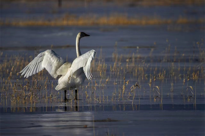 A whooper swan spreads its wings in the Keluke Lake-Tuosu Lake Nature Reserve in Haixi Mongolian and Tibetan Autonomous Prefecture, northwest China's Qinghai Province. (Photo/An Zi)