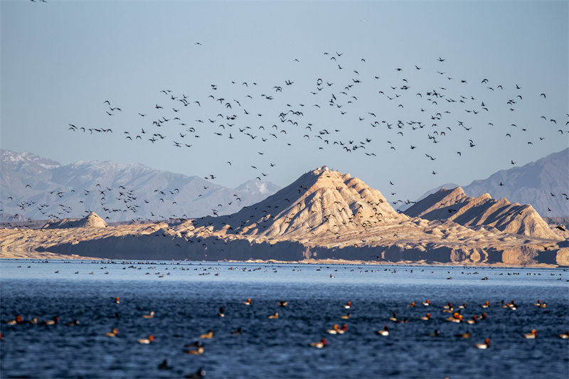 Migratory birds are seen in the Keluke Lake-Tuosu Lake Nature Reserve in Haixi Mongolian and Tibetan Autonomous Prefecture, northwest China's Qinghai Province. (Photo/An Zi)