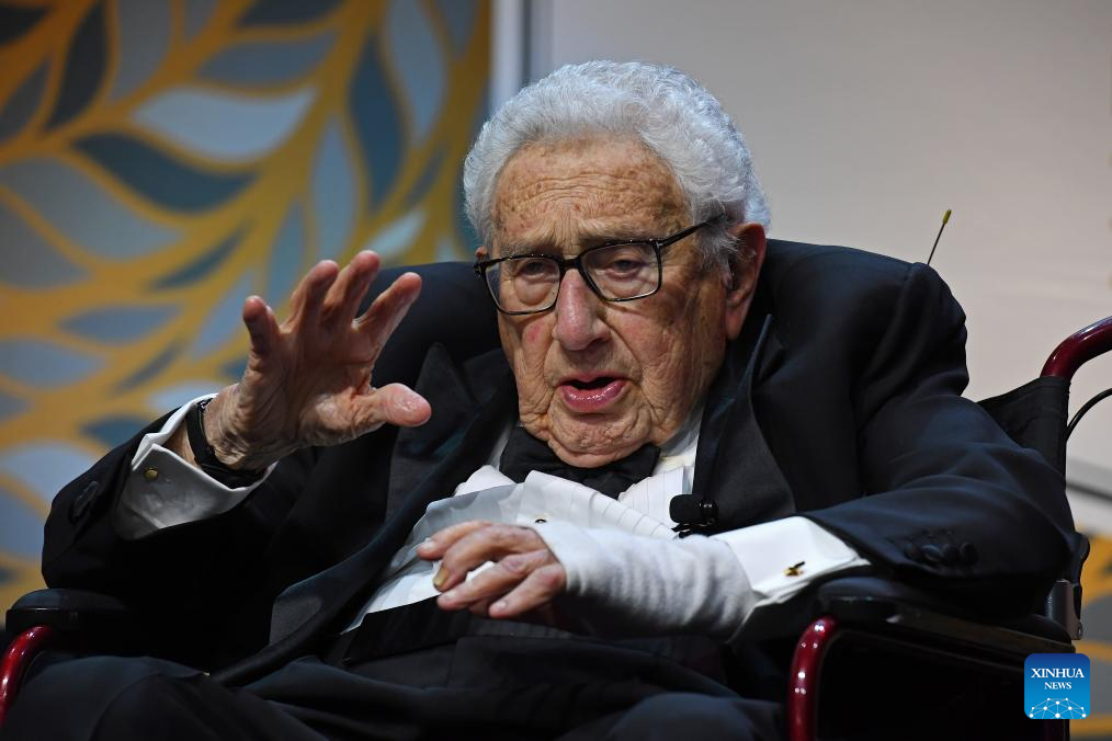 This file photo taken on Oct. 24, 2023 shows former U.S. Secretary of State Dr. Henry A. Kissinger speaking at the annual Gala Dinner of the National Committee on U.S.-China Relations in New York. Henry Kissinger passed away at 100 on Nov. 29, 2023. (Xinhua/Li Rui)