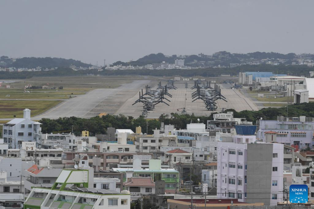 This file photo taken on Nov. 25, 2023 shows Osprey military transport aircrafts at a U.S. base in Okinawa, Japan. A U.S. Osprey military transport aircraft carrying eight people crashed off Japan's southwestern island of Yakushima in Kagoshima Prefecture on Wednesday, local media reported. (Xinhua/Feng Wuyong)
