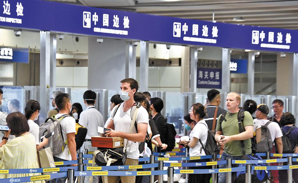 Tourists wait to pass through immigration at Beijing's Capital International Airport. LI XIN/XINHUA