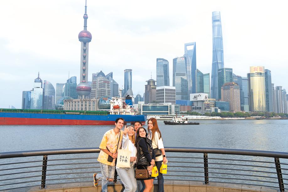 Visitors to the Bund in Shanghai in April pose for a photograph, with the Pudong financial district in the background. WANG GANG/FOR CHINA DAILY