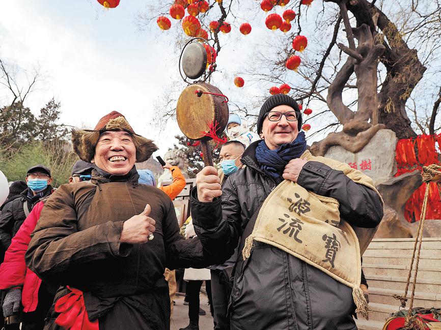 A foreign visitor dresses up as a vendor at a temple fair in suburban Beijing in January. DU JIANPO/FOR CHINA DAILY