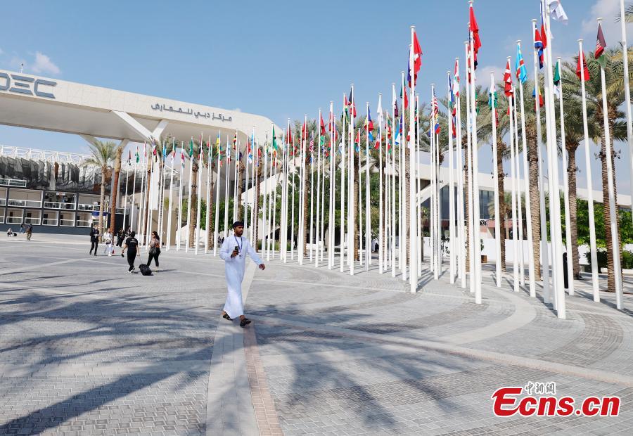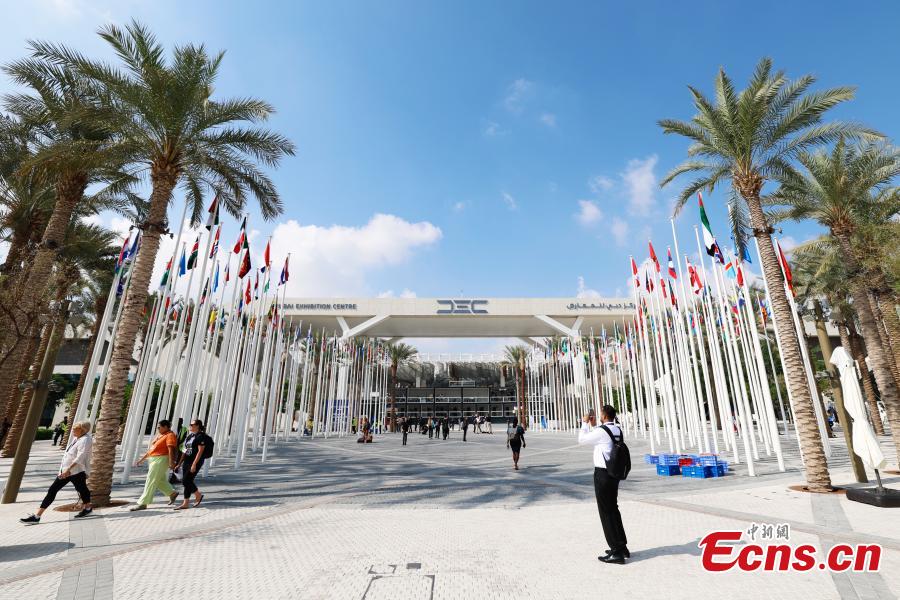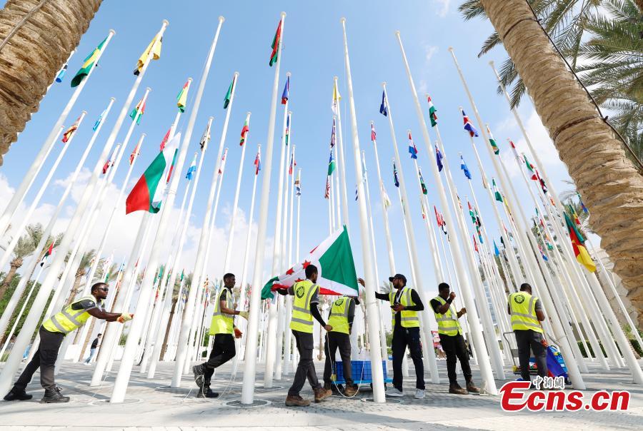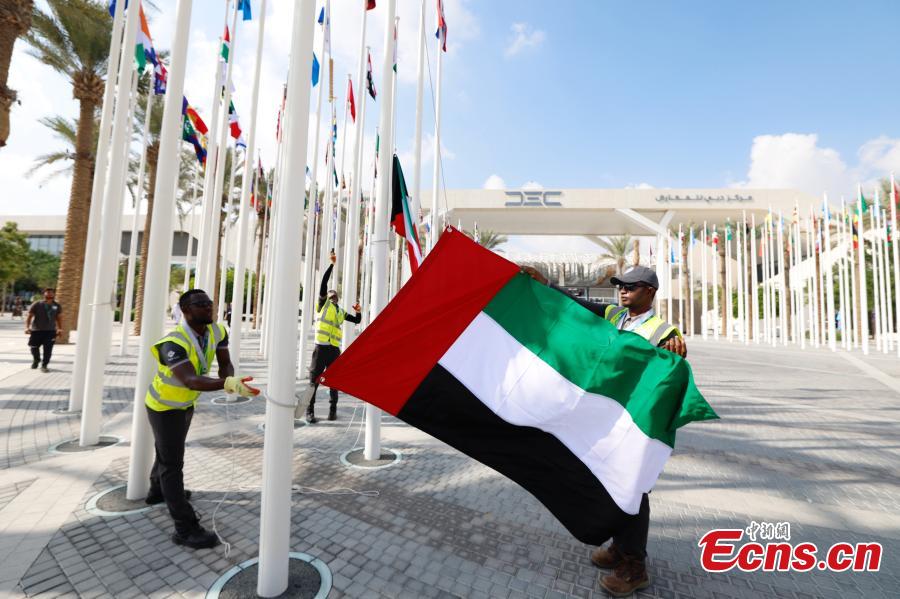 Staff members make preparations for the upcoming 28th session of the Conference of the Parties to the United Nations Framework Convention on Climate Change (COP28) at the Expo City in Dubai, the United Arab Emirates, Nov. 29, 2023. (Photo: China News Service/Liu Guanguan)