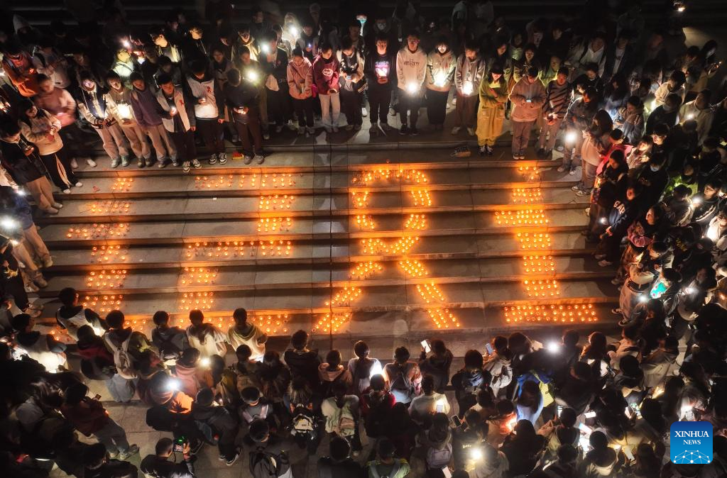 People hold a candle and a red ribbon during an event to raise awareness of AIDS at University of South China in Hengyang, central China's Hunan Province, Nov. 29, 2023. The World AIDS Day falls on Dec. 1. (Photo by Cao Zhengping/Xinhua)