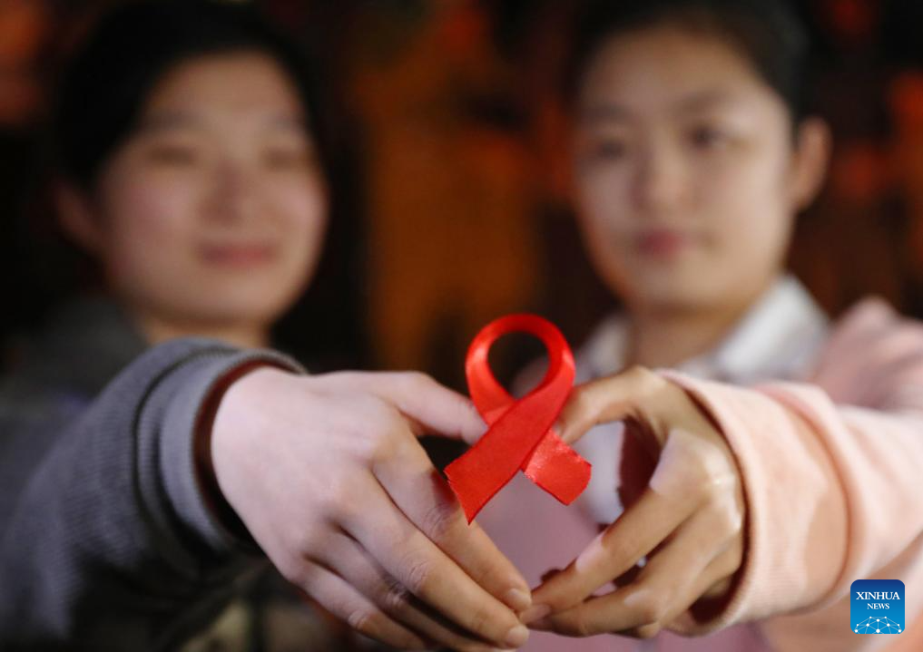 Students show a red ribbon during an event to raise awareness of AIDS at University of South China in Hengyang, central China's Hunan Province, Nov. 29, 2023. The World AIDS Day falls on Dec. 1. (Photo by Cao Zhengping/Xinhua)