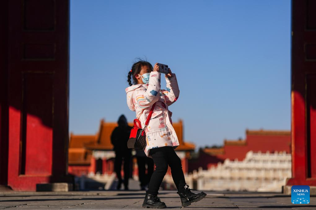A girl takes photos at the Palace Museum, also known as the Forbidden City, in Beijing, capital of China, Nov. 29, 2023. (Xinhua/Chen Yehua)