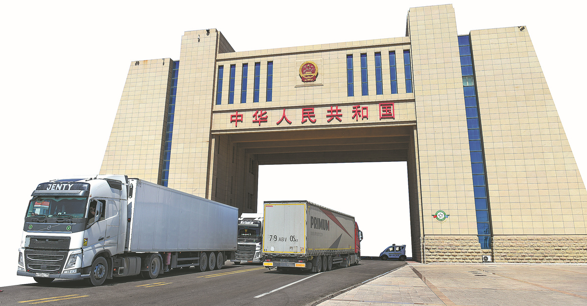 Trucks pass through the border between China and Kazakhstan at Alashankou Port in Xinjiang. DING LEI/XINHUA