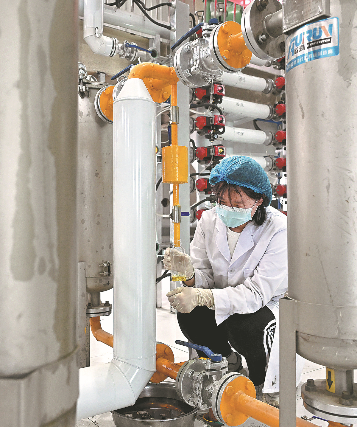 A technician examines flaxseed oil produced at a factory in Alashankou, Xinjiang. LI XIN/XINHUA