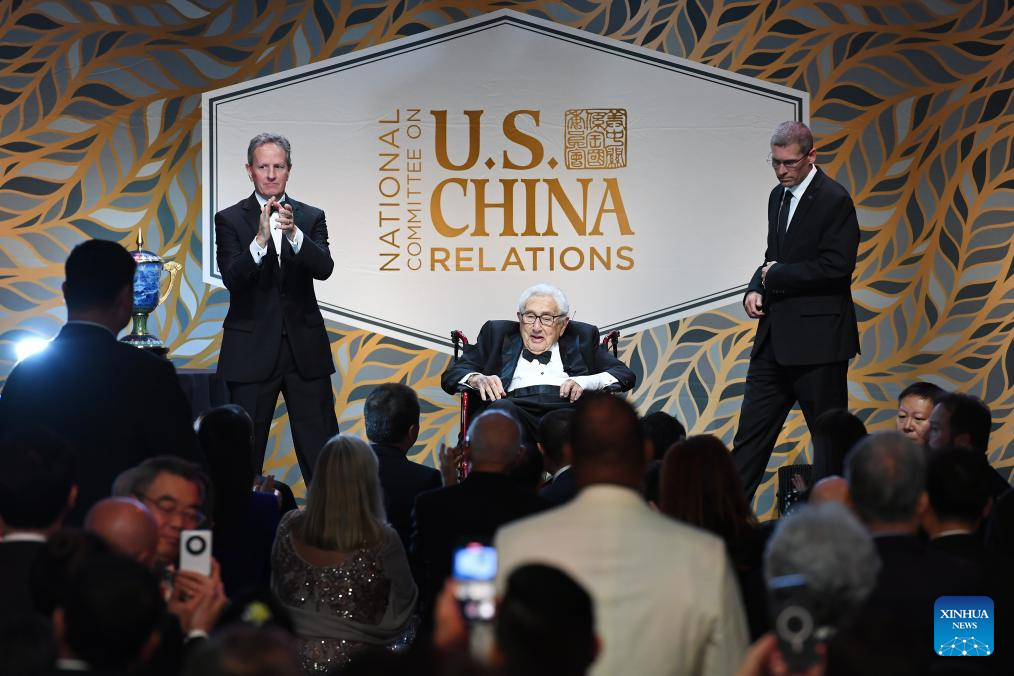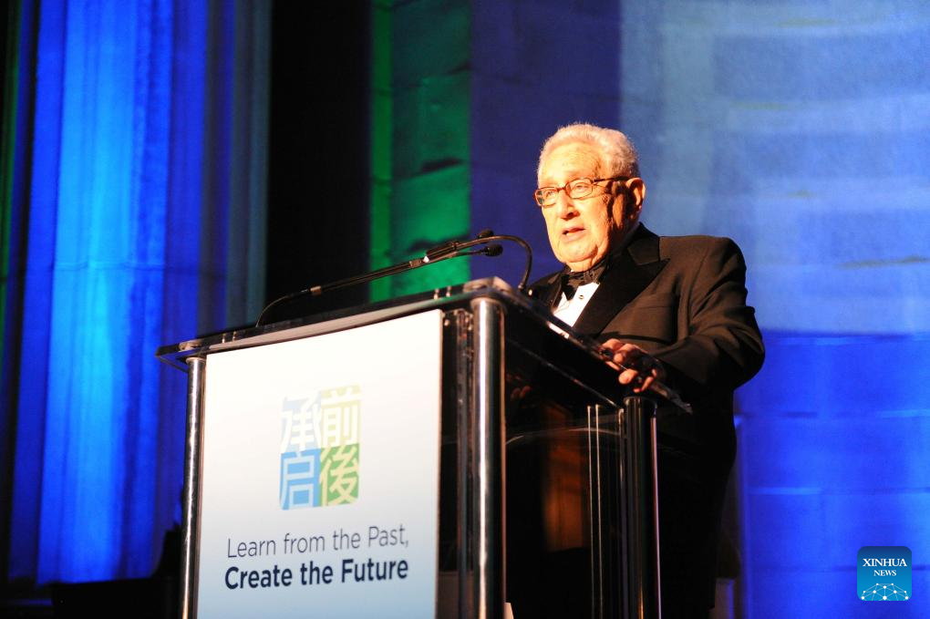 This file photo taken on Oct. 24, 2023 shows former U.S. Secretary of State Henry Kissinger (C) speaking at the annual Gala Dinner of the National Committee on U.S.-China Relations in New York, the United States. Henry Kissinger died on Wednesday at home in Connecticut at the age of 100. Kissinger had made it his lifelong pursuit to promote the development of China-U.S. relations and enhance the friendship between the two peoples. (Xinhua/Li Rui)