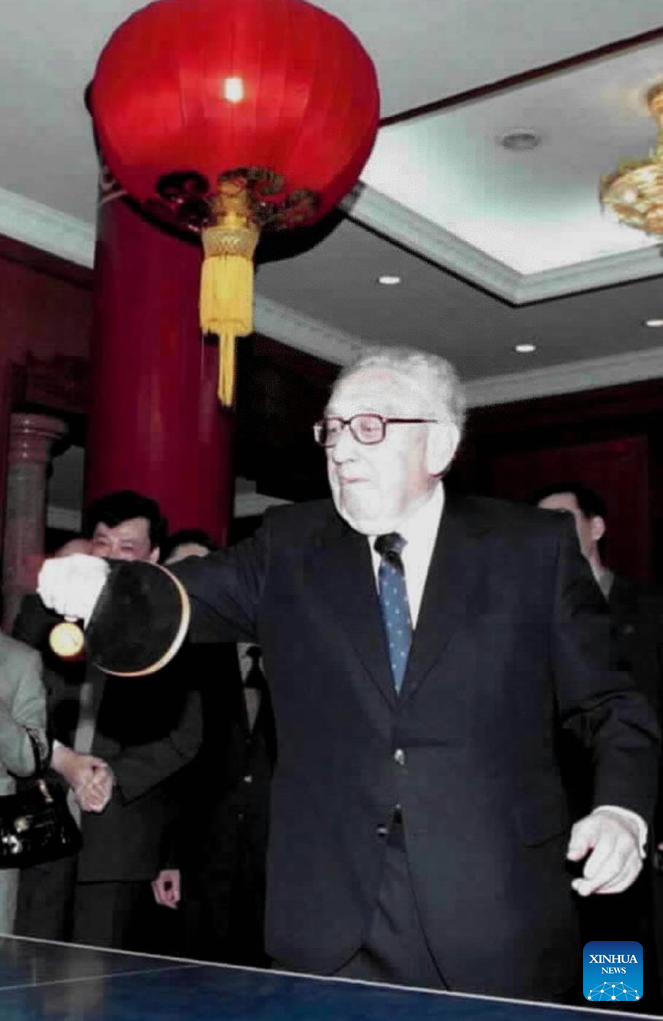 This file photo taken on March 18, 2001 shows former U.S. Secretary of State Henry Kissinger playing table tennis ahead of a reception held by the Chinese People's Association for Friendship with Foreign Countries to mark the 30th anniversary of the "ping-pong Diplomacy" in the China-U.S. relationship at the Diaoyutai State Guesthouse in Beijing, capital of China. Henry Kissinger died on Wednesday at home in Connecticut at the age of 100. Kissinger had made it his lifelong pursuit to promote the development of China-U.S. relations and enhance the friendship between the two peoples. (Xinhua/Xinhua)