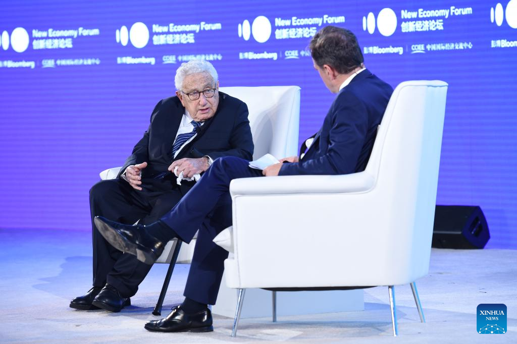 This file photo taken on Nov. 21, 2019 shows former U.S. Secretary of State Henry Kissinger (L) speaking at the New Economy Forum in Beijing, capital of China. Henry Kissinger died on Wednesday at home in Connecticut at the age of 100. Kissinger had made it his lifelong pursuit to promote the development of China-U.S. relations and enhance the friendship between the two peoples. (Xinhua/Dai Tianfang)