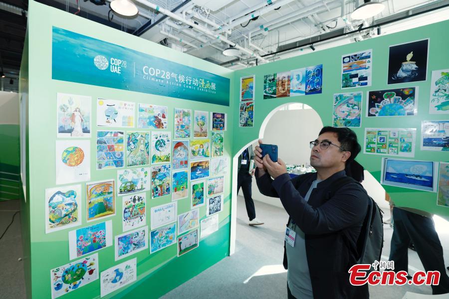 A visitor takes photos at the comic exhibition at the China Pavilion at the 28th session of the Conference of the Parties (COP28), the Expo City of Dubai, the United Arab Emirates, Nov. 30, 2023. (Photo: China News Service/Han Haidan)