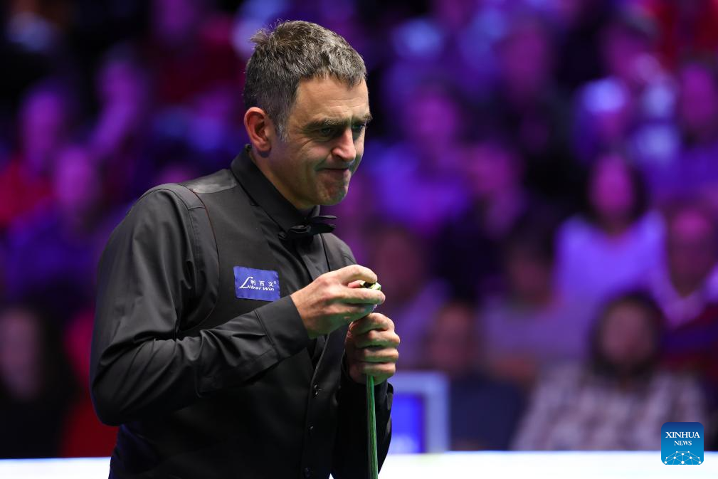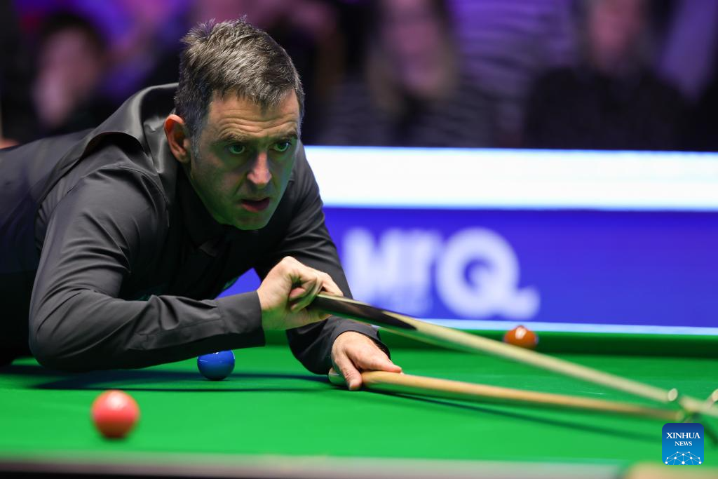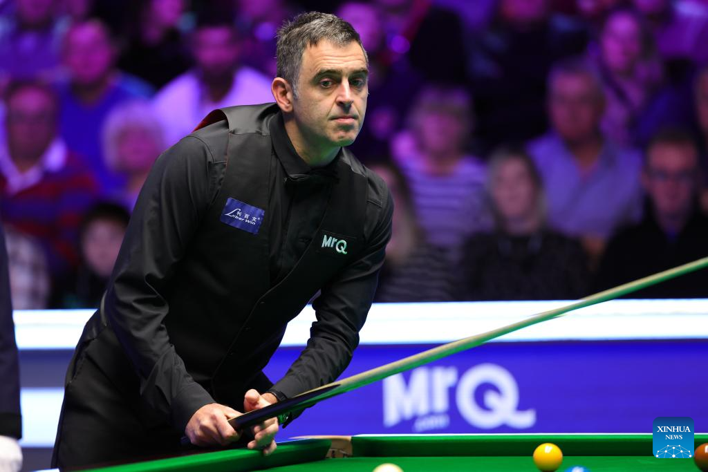 Ronnie O'Sullivan of England competes against Robert Milkins of England during the second round match at 2023 UK Snooker Championship in York, Britain, Nov. 30, 2023. (Photo by Zhai Zheng/Xinhua)
