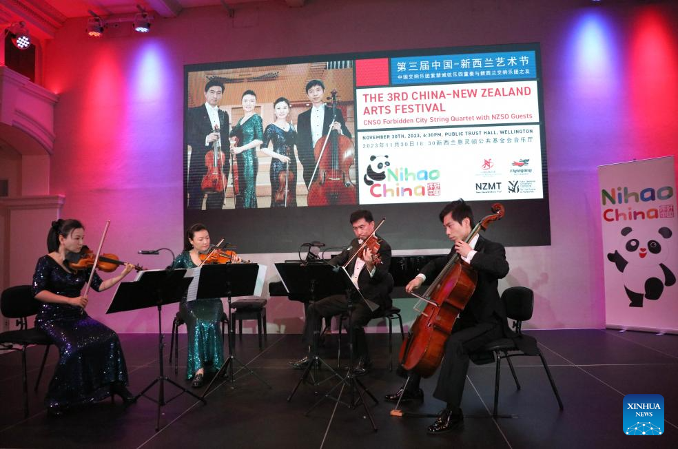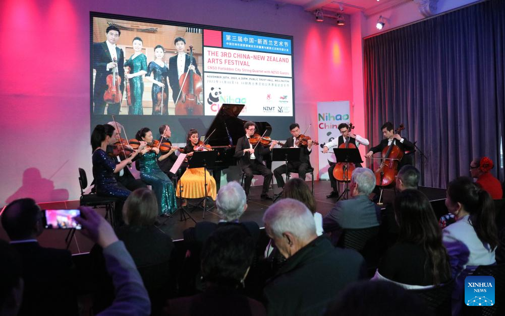 Musicians from New Zealand Symphony Orchestra perform during a music concert in Wellington, New Zealand, Nov. 30, 2023. The Third China-New Zealand Arts Festival kicked off in New Zealand's capital Wellington on Thursday night, with a music concert held successfully as a centerpiece of the event. (Photo by Meng Tao/Xinhua)