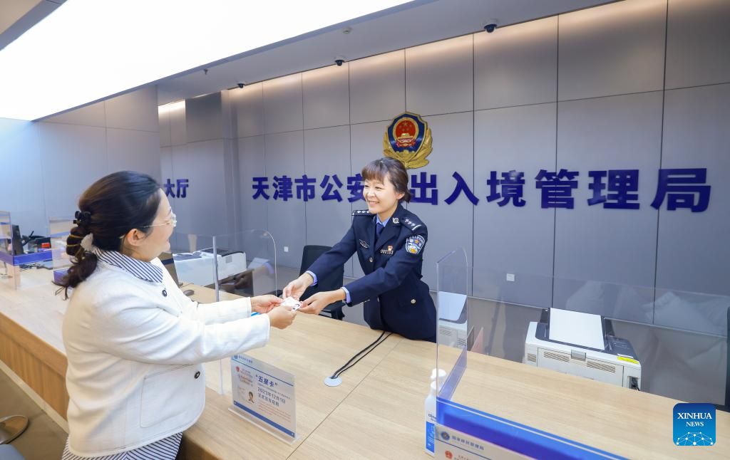 A police officer hands a new-version of Foreign Permanent Resident ID Card to an applicant at the department of exit-entry administration of Tianjin Municipal Public Security Bureau in Tianjin, north China, Dec. 1, 2023. (Xinhua/Sun Fanyue)