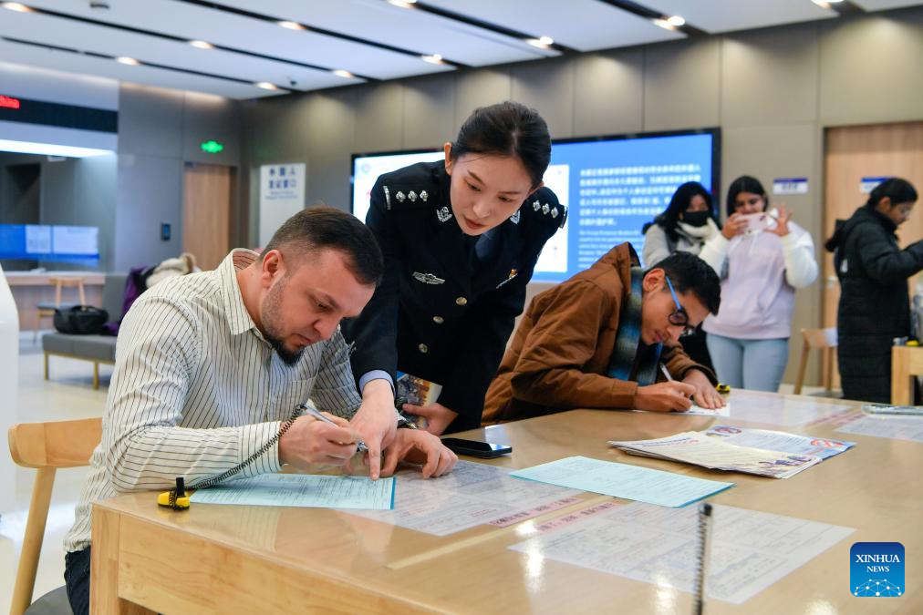A police officer helps as an applicant fills a form for the Foreign Permanent Resident ID Card at the department of exit-entry administration of Tianjin Municipal Public Security Bureau in Tianjin, north China, Dec. 1, 2023. (Xinhua/Sun Fanyue)
