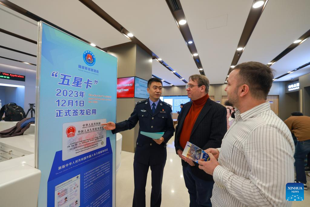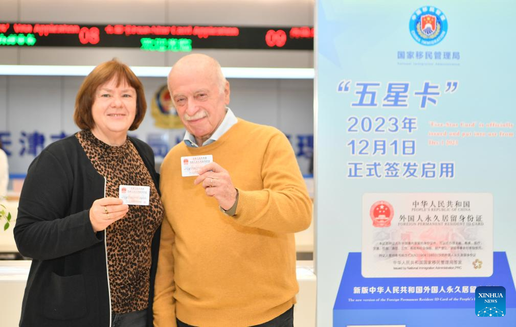 Card holders show their new-version of Foreign Permanent Resident ID Cards at the department of exit-entry administration of Tianjin Municipal Public Security Bureau in Tianjin, north China, Dec. 1, 2023. (Xinhua/Sun Fanyue)
