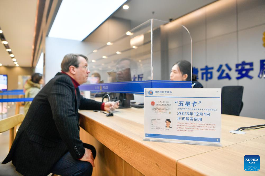 A foreigner applies for a Foreign Permanent Resident ID Card at the department of exit-entry administration of Tianjin Municipal Public Security Bureau in Tianjin, north China, Dec. 1, 2023. (Xinhua/Sun Fanyue)