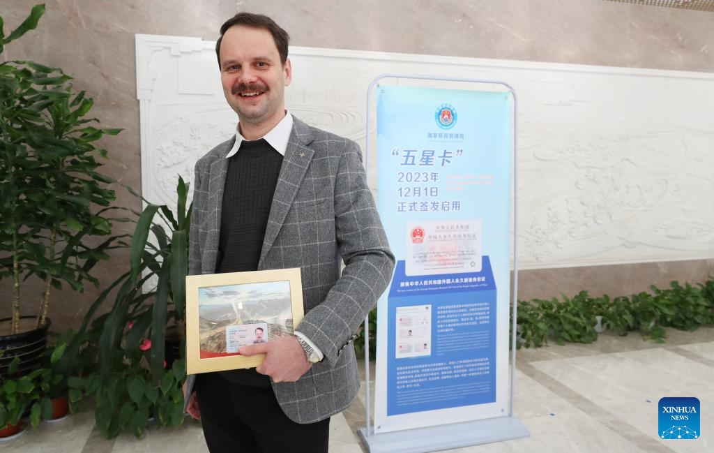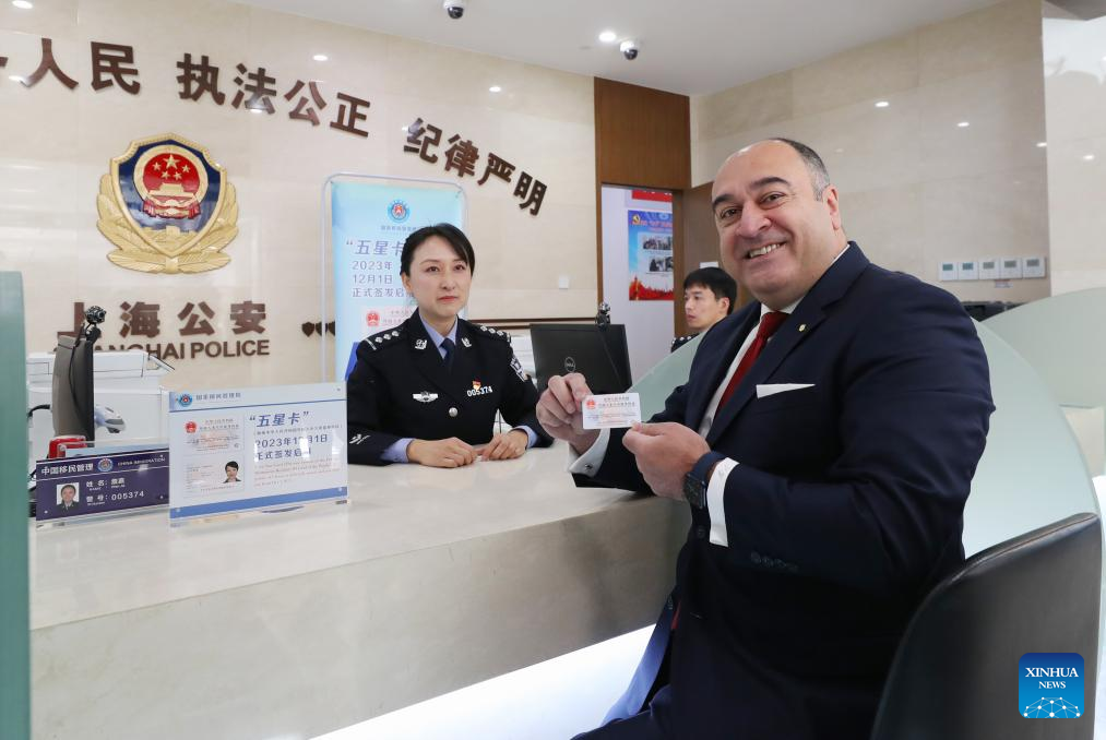 Yilmaz Mehmet Sinan from Trkiye shows the new-version of Foreign Permanent Resident ID Card he just received at the exit-entry administration bureau of Shanghai Public Security Bureau in Shanghai, east China, Dec. 1, 2023. (Xinhua/Fang Zhe)