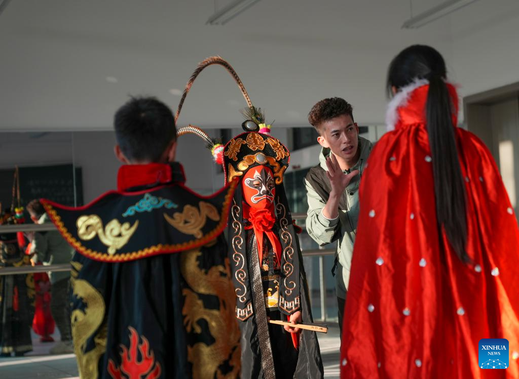 Folk artist Li Yong teaches a student the traditional "bian lian", or face-changing skills, at Wu'an primary school in Dianjiang County, southwest China's Chongqing, Nov. 28, 2023. With more than 600 students, Wu'an primary school in recent years cooperated with folk artist Li Yong and added face-changing as a special part to its curriculum. The face-changing technique is one of the most famous parts of Sichuan Opera, whereby actors rapidly alter their face makeup in stunning and dramatic effect. (Xinhua/Liu Chan)