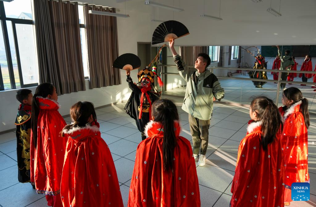 Folk artist Li Yong explains the decorations used in the traditional "bian lian" performance, or face-changing, at Wu'an primary school in Dianjiang County, southwest China's Chongqing, Nov. 28, 2023. With more than 600 students, Wu'an primary school in recent years cooperated with folk artist Li Yong and added face-changing as a special part to its curriculum. The face-changing technique is one of the most famous parts of Sichuan Opera, whereby actors rapidly alter their face makeup in stunning and dramatic effect. (Xinhua/Liu Chan)