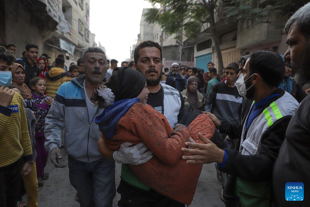 People rescue the injured after Israeli air strikes in the southern Gaza Strip city of Khan Younis, Dec. 1, 2023. (Photo by Rizek Abdeljawad/Xinhua)
