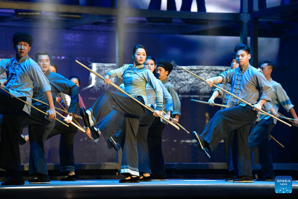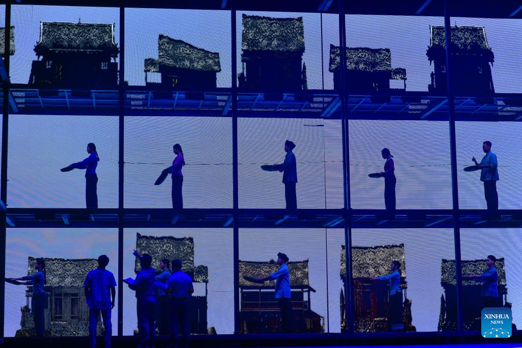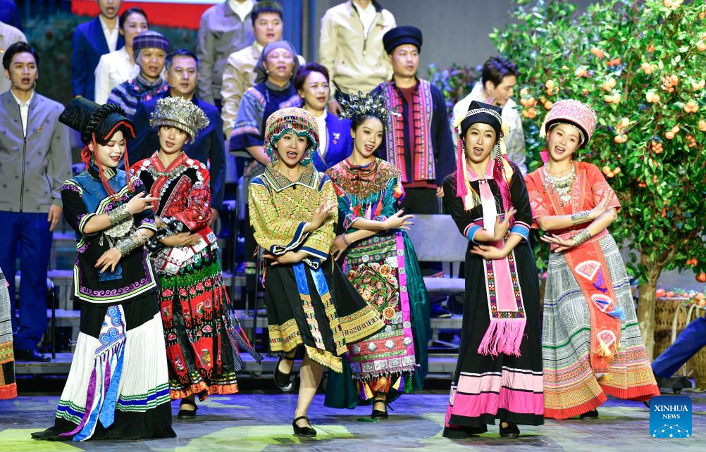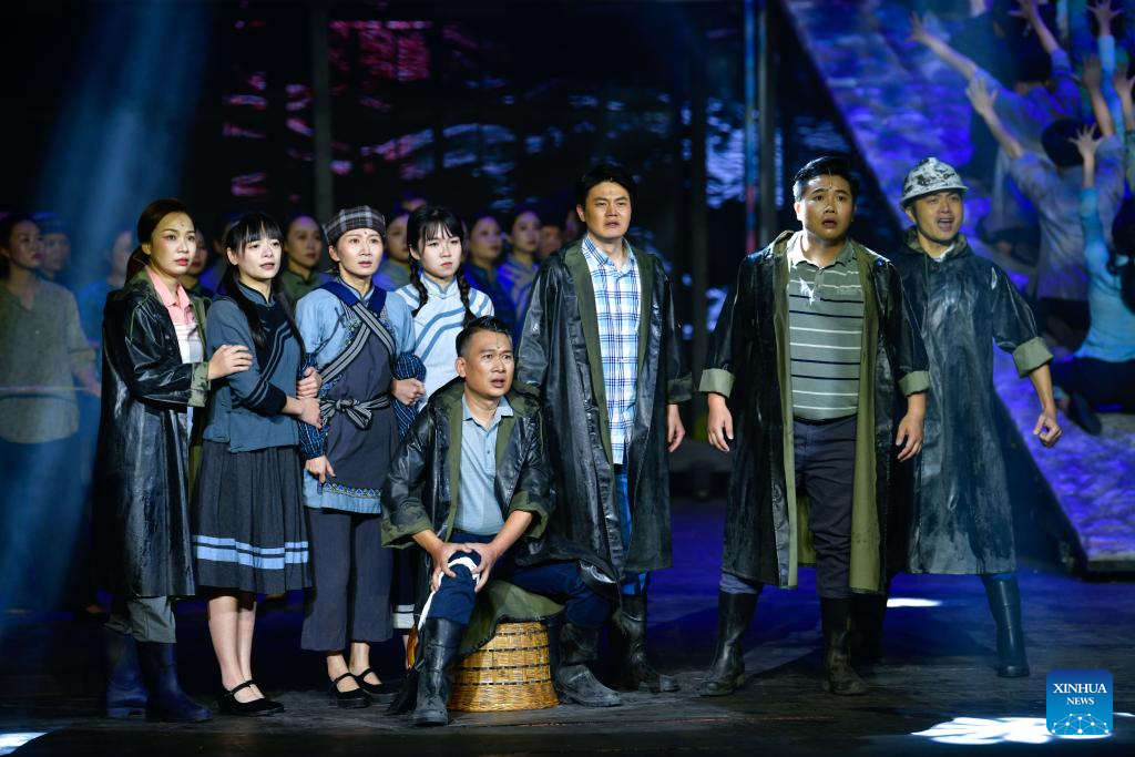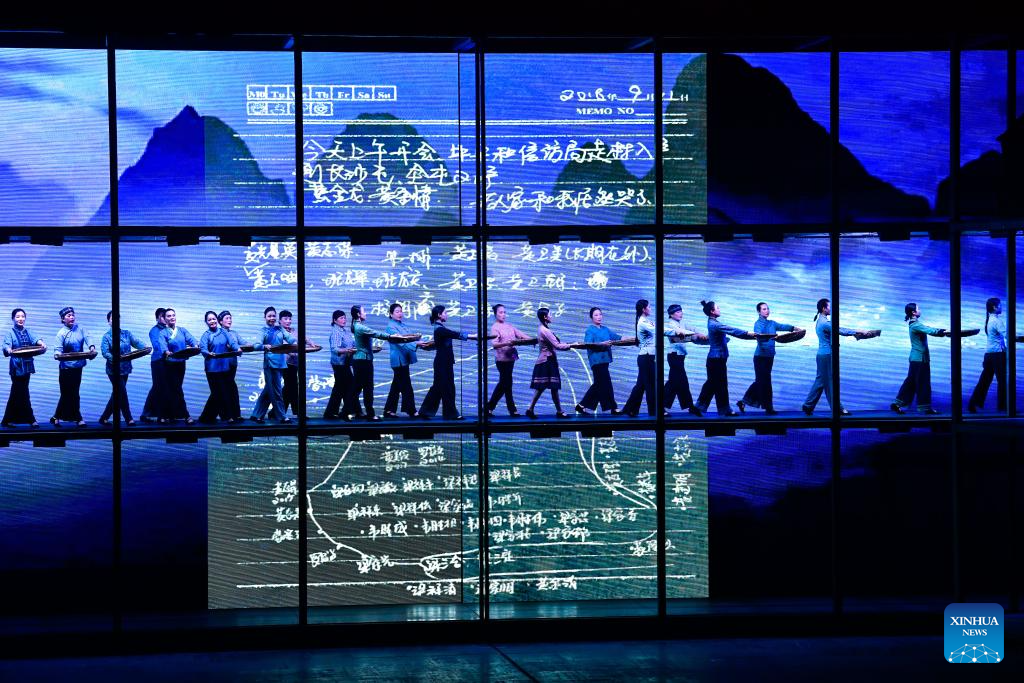Artists perform in an opera based on the story of Huang Wenxiu, a village official who died in 2019 on the frontline of China's war against poverty, at Guiyang Grand Theatre in Guiyang, southwest China's Guizhou Province, Nov. 30, 2023. (Xinhua/Yang Wenbin)