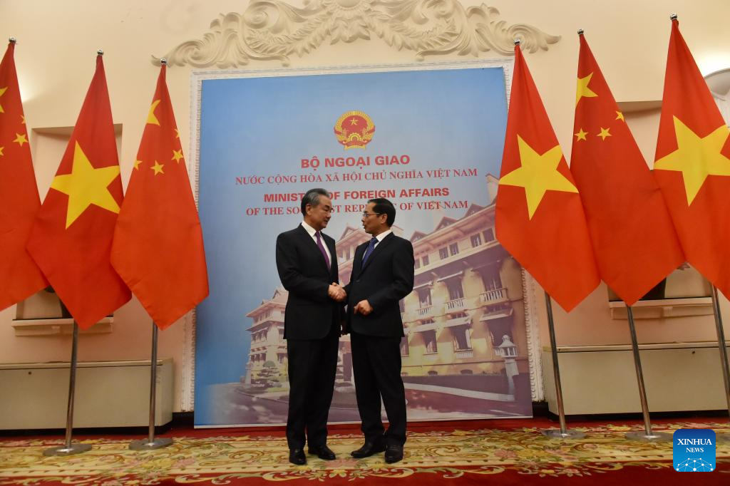 Chinese Foreign Minister Wang Yi (L), also a member of the Political Bureau of the Communist Party of China Central Committee, shakes hands with Vietnamese Foreign Minister Bui Thanh Son during their meeting in Hanoi, Vietnam, on Dec. 1, 2023. (Xinhua/Hu Jiali)
