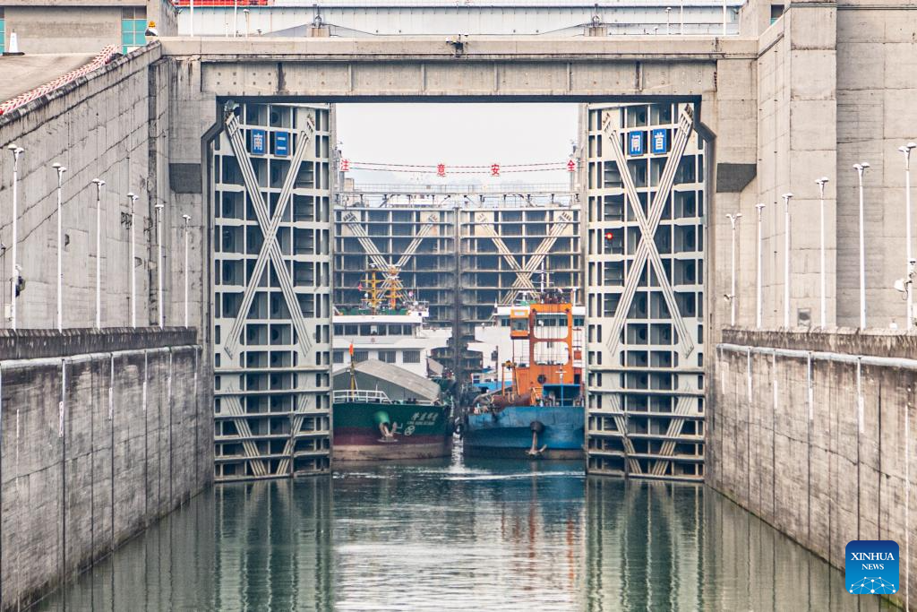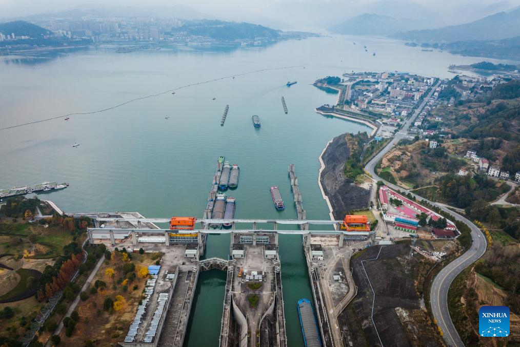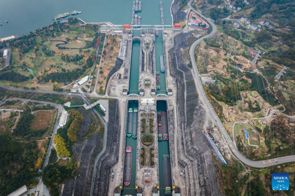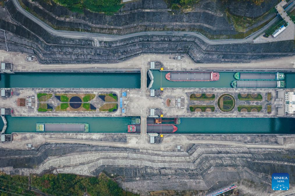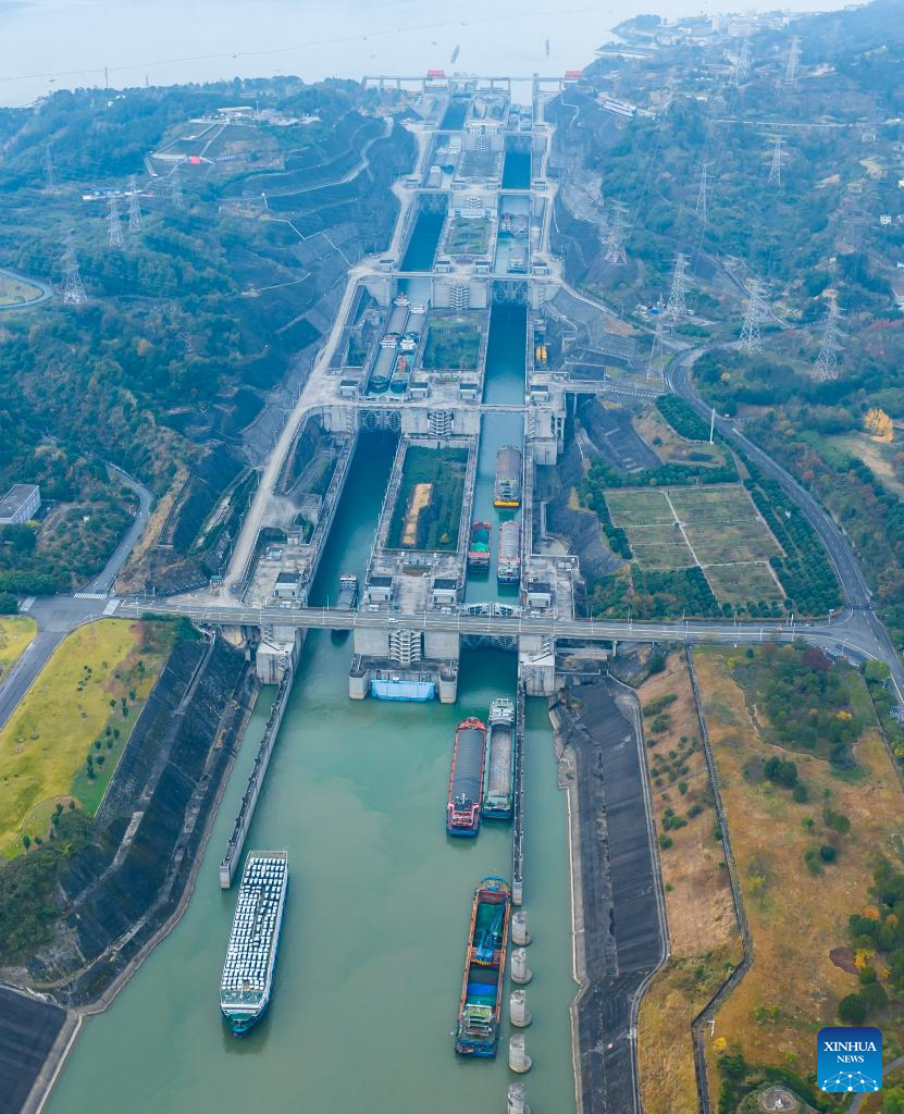 Vessels pass through the five-tier ship locks of the Three Gorges Dam in Yichang, central China's Hubei Province, Dec. 1, 2023. (Xinhua/Tang Yi)