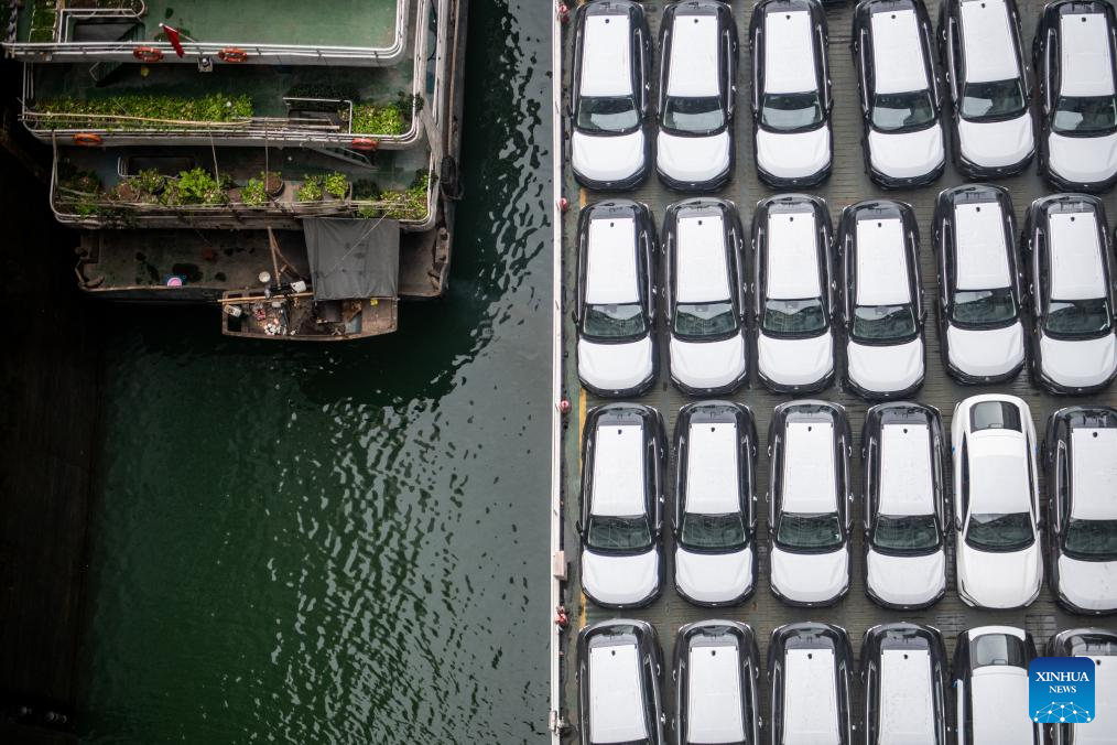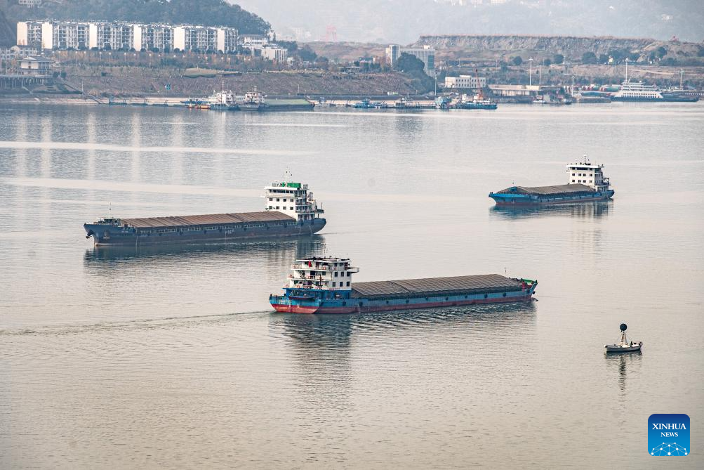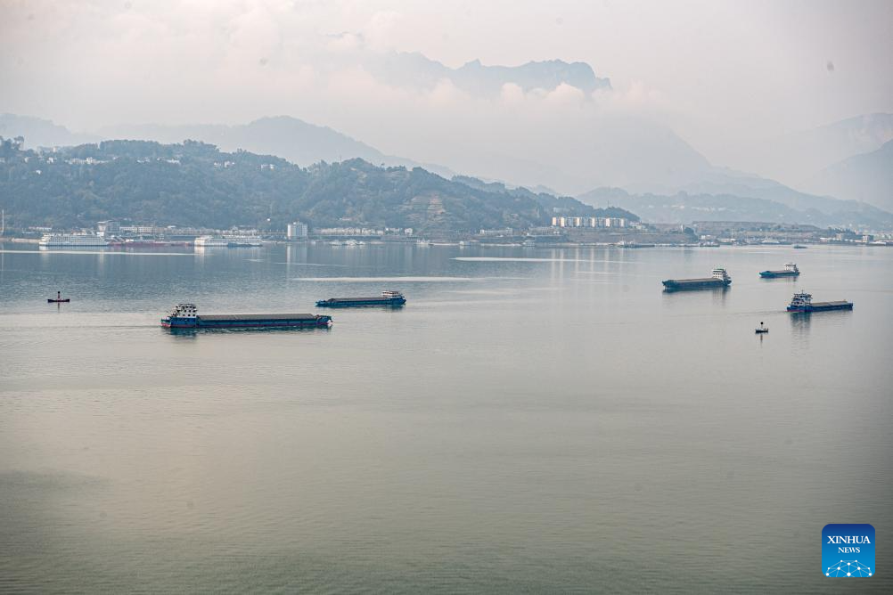 Cargo vessels sail near the Three Gorges Dam in Yichang, central China's Hubei Province, Dec. 1, 2023. (Xinhua/Tang Yi)