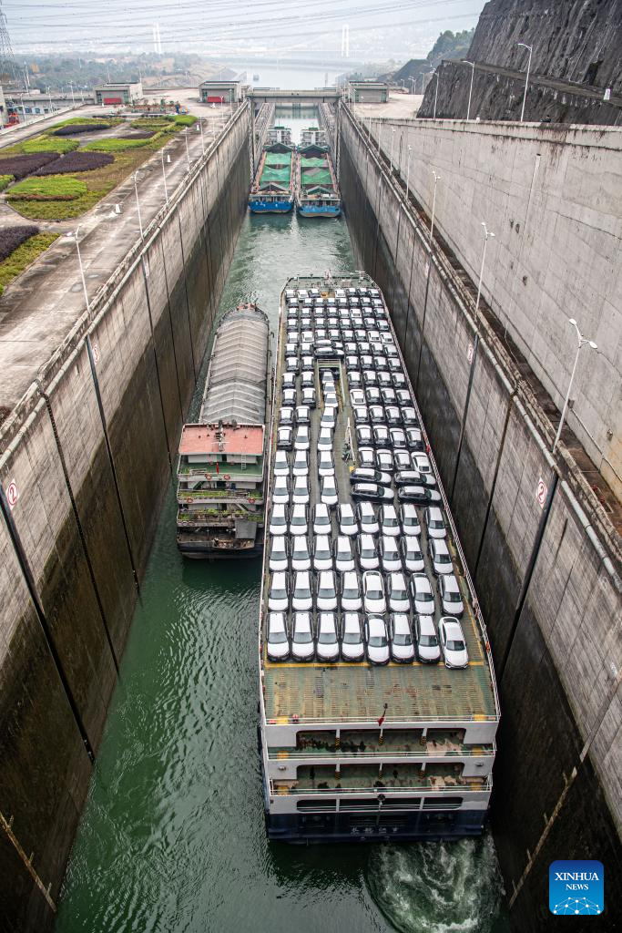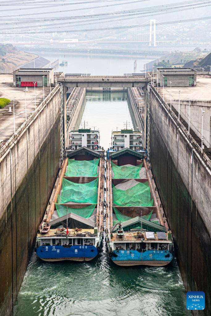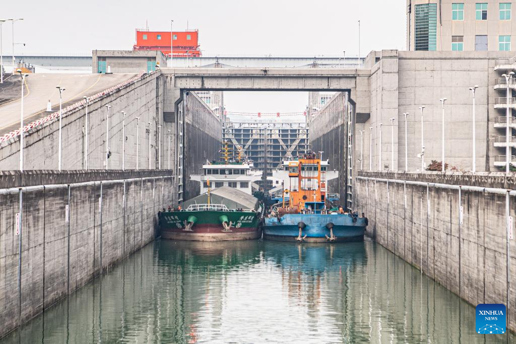 Cargo vessels pass through the five-tier ship locks of the Three Gorges Dam in Yichang, central China's Hubei Province, Dec. 1, 2023. (Xinhua/Tang Yi)