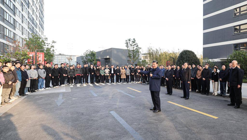 Chinese President Xi Jinping, also general secretary of the Communist Party of China (CPC) Central Committee and chairman of the Central Military Commission, inspects a government-subsidized rental housing community in east China's Shanghai, Nov. 29, 2023. Xi made an inspection tour in east China's Shanghai from Tuesday to Wednesday. During his trip, Xi inspected the Shanghai Futures Exchange, an exhibition on Shanghai's sci-tech innovations, and a government-subsidized rental housing community, learning about the city's efforts in strengthening its competitiveness as an international financial center, building the city into an international sci-tech innovation center, and constructing government-subsidized rental housing projects. (Xinhua/Wang Ye)