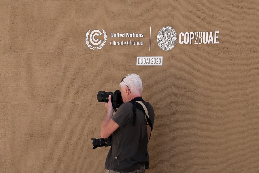 A photographer takes photos beside a logo of COP28 in Dubai, the United Arab Emirates, Nov 29, 2023. [Photo/Xinhua]