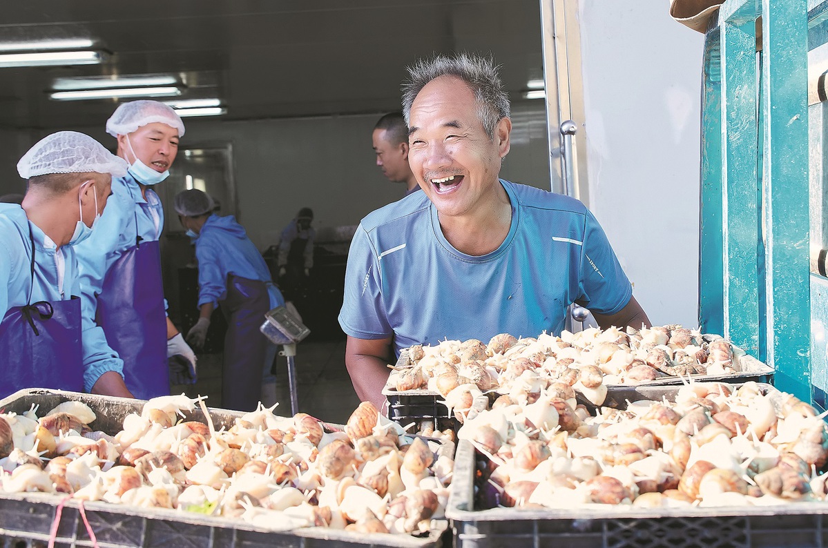 A local farmer sells snails to Jiaxing Qianfu Food Co. The company offers snail breeding training and purchase deals. CHINA DAILY