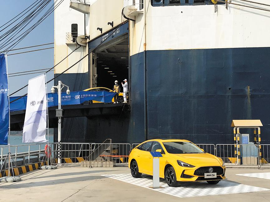 A MG 5 near a ship loaded with MG vehicles made at SAIC's plant in Fujian province in early 2023. LI FUSHENG/CHINA DAILY