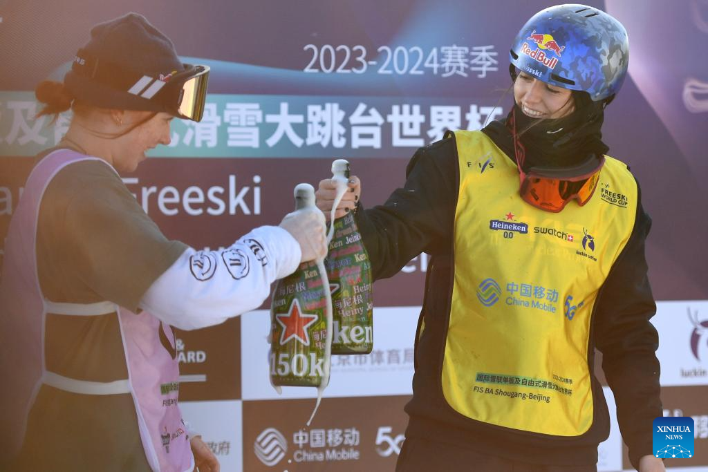 Mathilde Gremaud (R) of Switzerland celebrates with Kirsty Muir of Britain during the awarding ceremony after women's freeski big air final at the FIS Snowboard and Freeski Big Air World Cup at Big Air Shougang in Beijing, capital of China, Dec. 2, 2023. (Xinhua/Ju Huanzong)