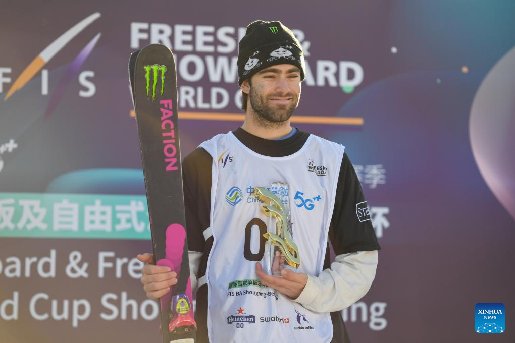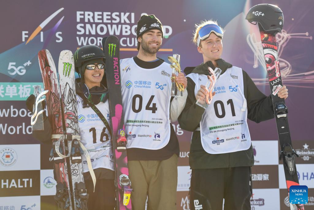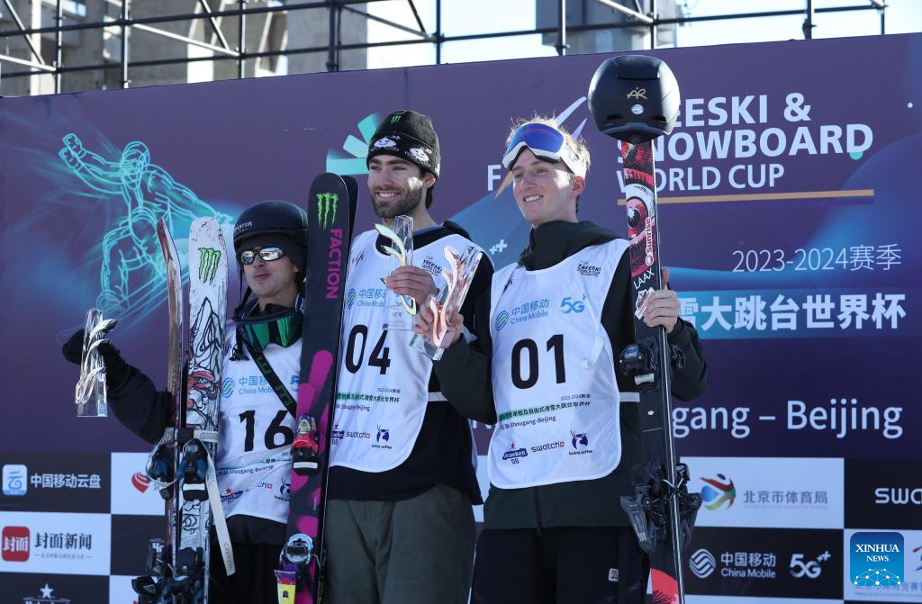 Gold medalist Alexander Hall of the United States poses for photos during the awarding ceremony after the men's freeski big air final at the FIS Snowboard and Freeski Big Air World Cup at Big Air Shougang in Beijing, capital of China, Dec. 2, 2023. (Xinhua/Ju Huanzong)