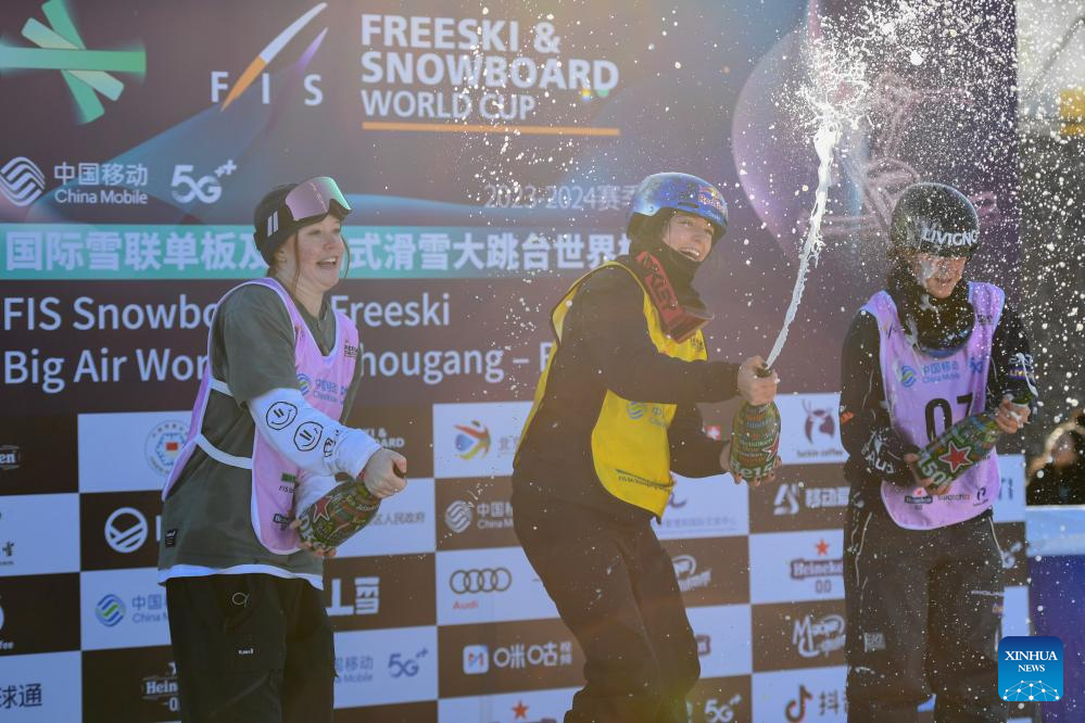 Gold medalist Mathilde Gremaud (C) of Switzerland, silver medalist Kirsty Muir (L) of Britain and bronze medalist Flora Tabanelli of Italy celebrate during the awarding ceremony after the women's freeski big air final at the FIS Snowboard and Freeski Big Air World Cup at Big Air Shougang in Beijing, capital of China, Dec. 2, 2023. (Xinhua/Xu Yanan)